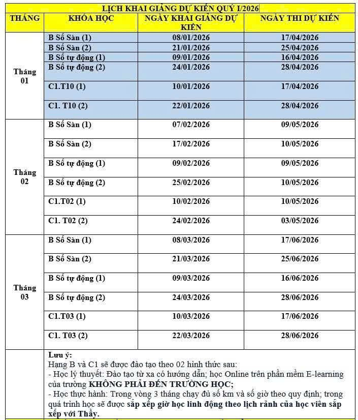 LỊCH KHAI GIẢNG KHÓA HỌC LÁI XE QUÝ II/2026
