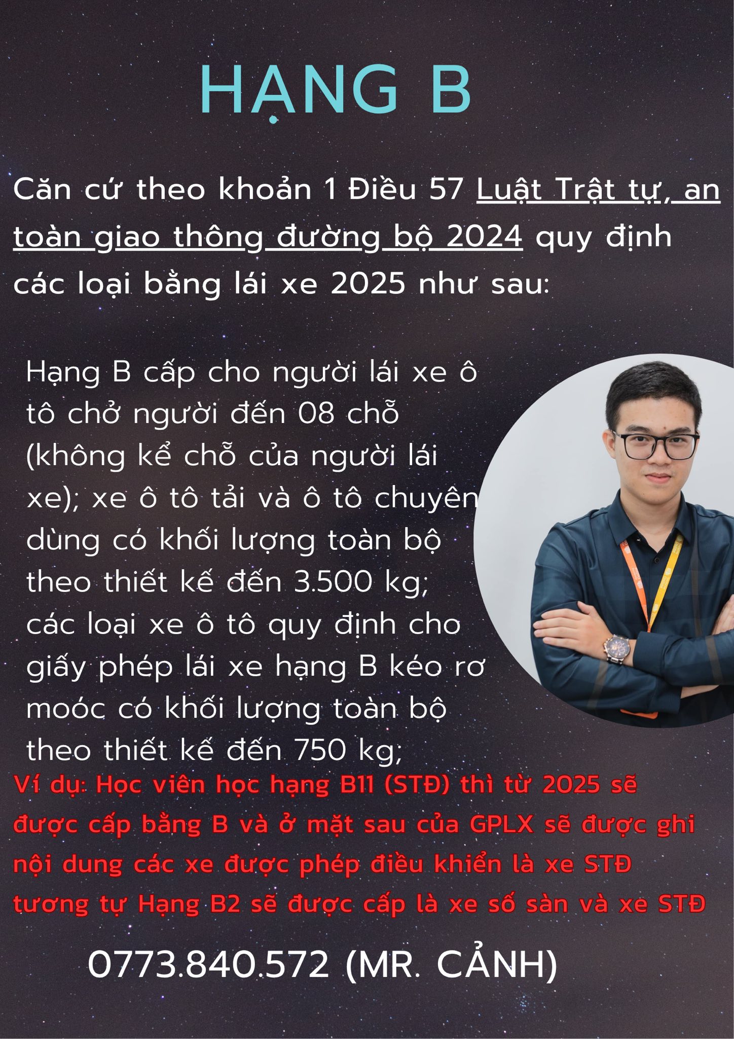 1. Theo quy định Luật Trật tự, an toàn giao thông đường bộ số 36/2024/QH15 ngày 27-6-2024 quy định trường hợp người có giấy phép lái xe đã được cấp trước ngày luật này có hiệu lực thi hành (1-1-2025) hạng B và C1 cấp cho: